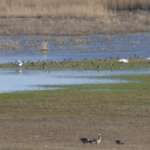 Die ungewöhnlich warmen Temperaturen und ausgedehnte Flachwasserbereiche im Leinepolder locken derzeit viele Vögel ins Leinetal. Noch sind viele Tundrasaatgänse und auch Blässgänse bei uns, die den Winter hier verbringen. Dazu kommen jetzt die ersten Rückkehrer aus den südlichen Winterquartieren, wie Kiebitze, Kraniche und Stare.