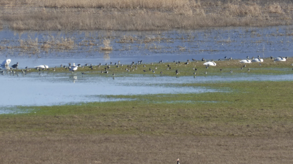 Die ungewöhnlich warmen Temperaturen und ausgedehnte Flachwasserbereiche im Leinepolder locken derzeit viele Vögel ins Leinetal. Noch sind viele Tundrasaatgänse und auch Blässgänse bei uns, die den Winter hier verbringen. Dazu kommen jetzt die ersten Rückkehrer aus den südlichen Winterquartieren, wie Kiebitze, Kraniche und Stare.